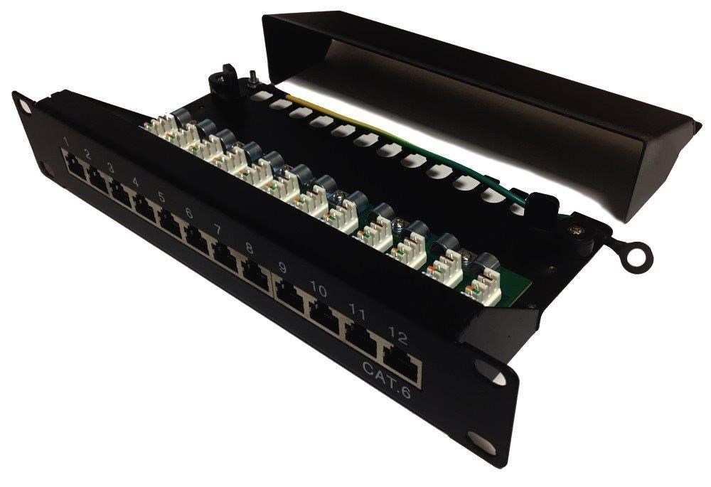 Patch panel vybavený 12 portami s Cat.6, vhodný pre nárazník typu LSA. Vnútorný kryt patch panelu umožňuje manipuláciu v malej skrinke bez rizika vytiahnutia kábla z rýchlokonektora. Svorky na správu káblov umožňujú pevne pritiahnuť káblový výstup k panelu. Súčasťou zariadenia je uzemnenie a pripojenie tienenia priamo k DPS.