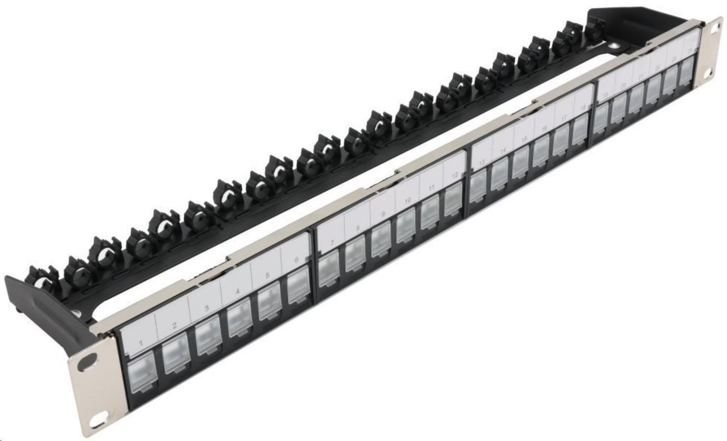 Kovový patch panel s jedinečným spôsobom inštalácie kľúčových kameňov s uzdou. Predný panel je pokrytý štyrmi plastmi so 4 otvormi, je možné osadiť 4 moduly so 6 pozíciami lichobežníkového skreslenia. Poloha uzemňovacieho kábla a značky