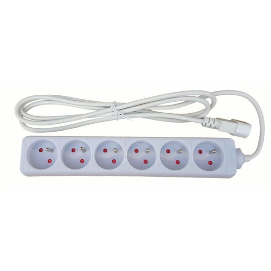 Predlžovací kábel 6x230V CEE7/5 na pripojenie k UPS s konektormi IEC 320-C14. Počet výstupných zásuviek: 6 Dĺžka kábla: 2 m, 3x0,75 mm2 Maximálne napätie: 230V Maximálny prúd: 10ABalené v PE vrecku.