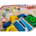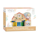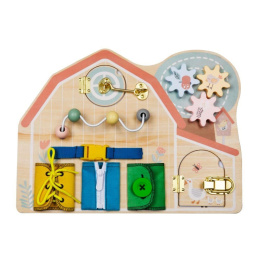 Aktivity board v podobe farmy zaviedne dievčatá aj chlapcov na vidiek, kde si pohrajú s hracími prvkami a osvojí si pár praktických zručností. Activity board s ozubenými kolami, korálkovým bludišťom, dvierkami a okienkom, rôznymi zámkami a rôznymi spôsobmi zapínania vedie deti k samostatnosti v hre, v poznávaní a učení sa, v obliekaní.