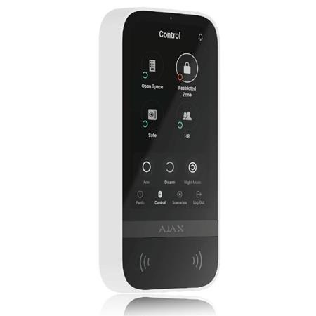 Klávesnica KeyPad TouchScreen zdedila rozhranie aplikácií Ajax pre chytré telefóny a poskytuje tak jednoduché a známe ovládanie systému. Päťpalcová dotyková obrazovka umožňuje rýchly prístup k aktuálnemu režimu zabezpečenia ľubovoľnej skupiny. Aktivuje sa zdvihnutím ruky v blízkosti a má automatickú reguláciu jasu. Klávesnica má zvukovú indikáciu a môže upozorňovať na alarmy, oneskorenie pri vstupe/výstupe a otvorenie dverí pri odomknutí systému. Hlasitosť sa nastavuje v aplikáciách Ajax. Klávesnica tiež zobrazuje výsledok kontroly integrity systému a informuje o poruchách pri zastrešení.