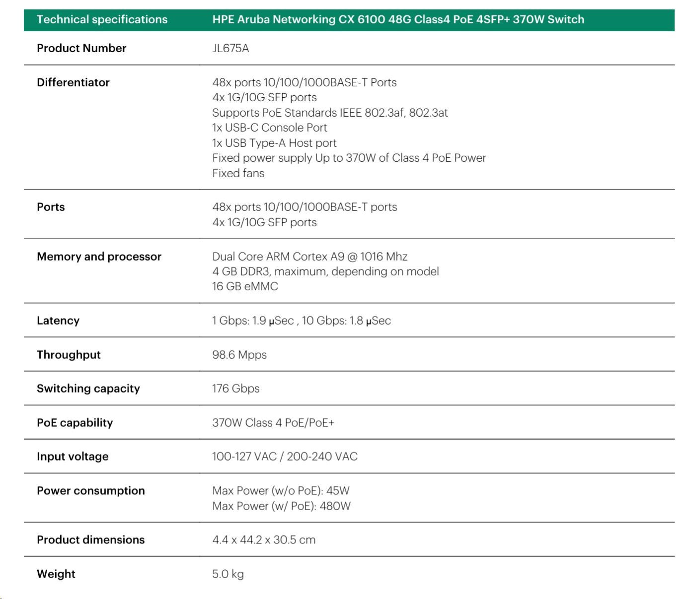 | Aruba 6100 48G Class4 PoE 4SFP+ 370W Switch (JL675A)) | |