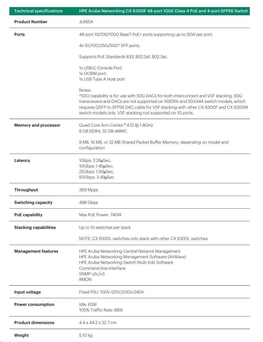 HPE Aruba Networking CX 6300F 48-port 1GbE Class 4 PoE and 4-port SFP56 Switch