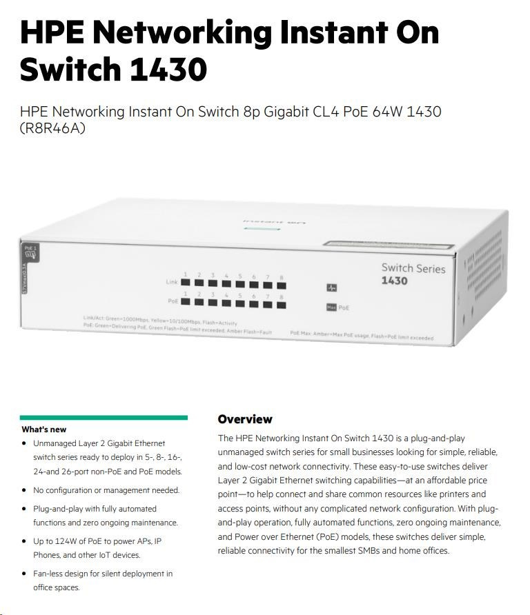 Popis HPE Networking Instant On Switch 8p Gigabit CL4 PoE 64W 1430