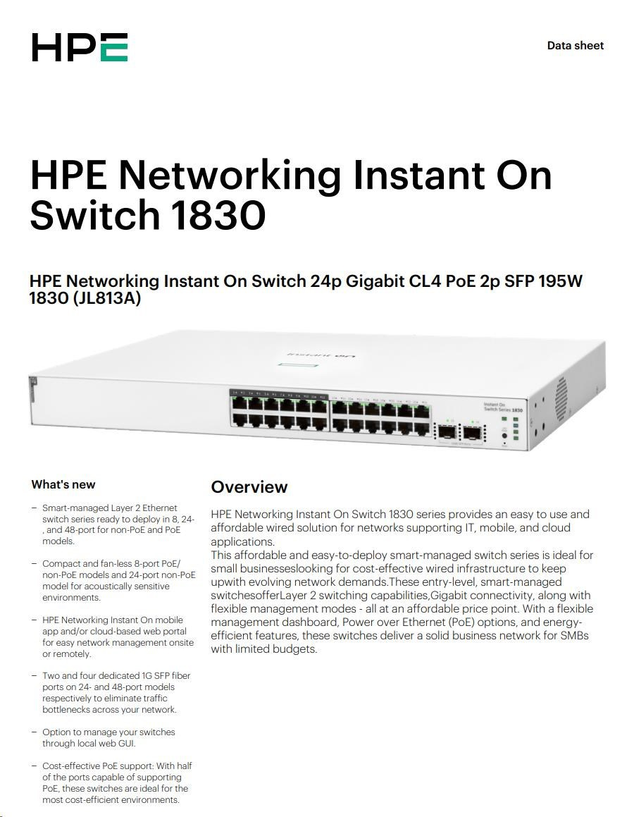 | Aruba Instant On 1830 8G Switch (JL810A) | Aruba Instant On 1830 8G 4p Class4 PoE 65W Switch (JL811A) | Aruba Instant On 1830 24G 2SFP Switch (JL812A) | Aruba Instant On 1830 24G 12p Class4 PoE 2SFP 195W Switch (JL813A) | Aruba Instant On 1830 48G 4SFP Switch (JL814A) | Aruba Instant On 1830 48G 24p Class4 PoE 4SFP 370W Switch (JL815A) | ||||||||