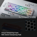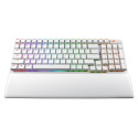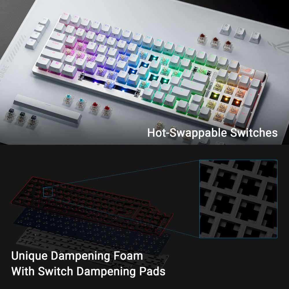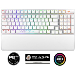 Bezdrôtová herná klávesnica ROG Strix Scope II 96 s pripojením v troch režimoch, klávesové skratky pre streamovanie, multifunkčné ovládacie prvky, mechanické spínače ROG NX s možnosťou výmeny za prevádzky, stabilizátory klávesnice ROG, krytky kláves PBT doubleshot a silikonová tlmená pena, tri uhly sklonu a opierka zápästia