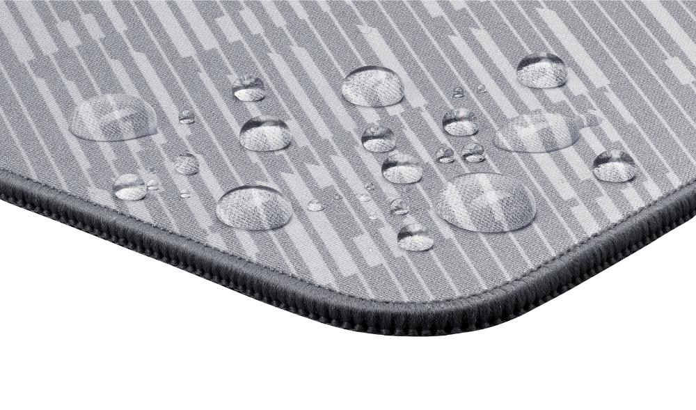 ROG Scabbard II Arctic Gray XXL je veľká herná podložka pod myš s povrchom odolným voči vode, oleju a prachu, s plochými prešívanými okrajmi proti odieraniu a protisklzovou gumou dole.