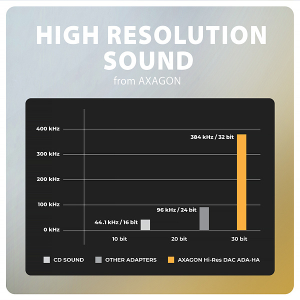 AXAGON ADA-HA Hi-Res DAC AUDIO ADAPTER je praktickým doplňkem pro notebook nebo stolní počítač s USB-A konektorem, který poskytne kvalitnější zvuk než vestavěný audio konektor. Adaptér funguje jako externí USB zvuková karta s DAC převodníkem podporujícím Hi-Res Audio se vzorkováním až 384 kHz / 32 bitů, což zajišťuje čistý a detailní zvuk.