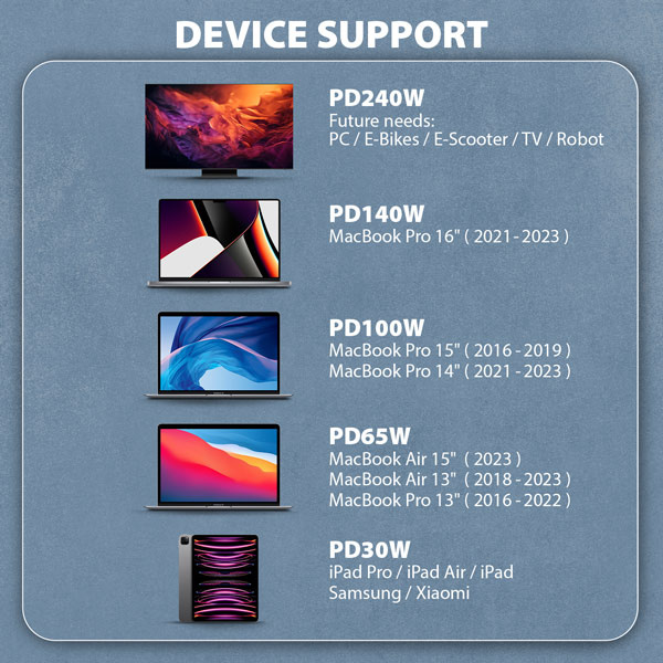 • Vhodné pre počítače, notebooky, mobilné telefóny, tablety, powerbanky, elektrické náradie a ďalšie zariadenia s konektorom USB-C.