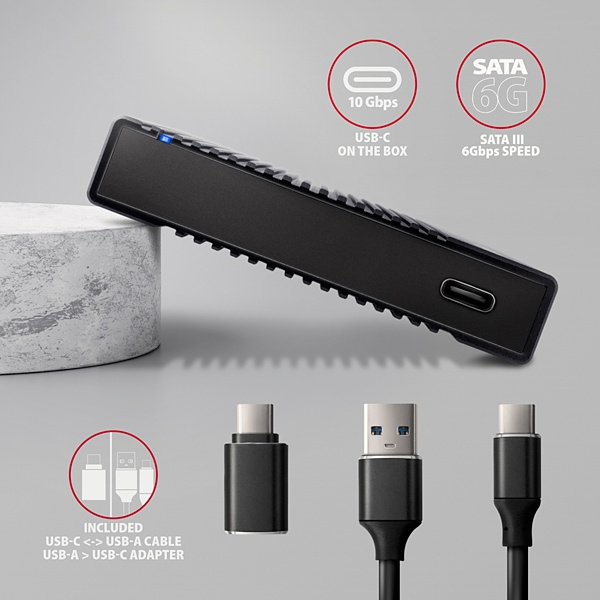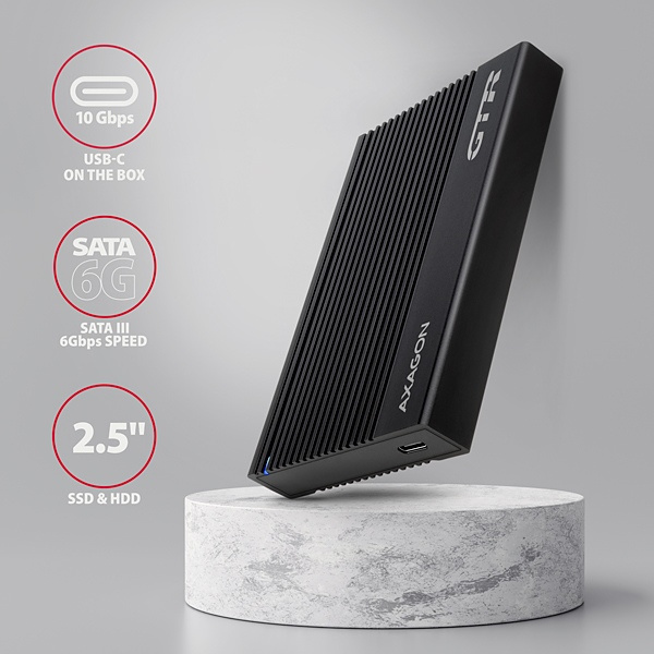 Popis AXAGON EE25-GTR, USB-C 10Gbps - SATA 6G 2.5" RIBBED box, čierny