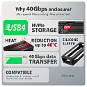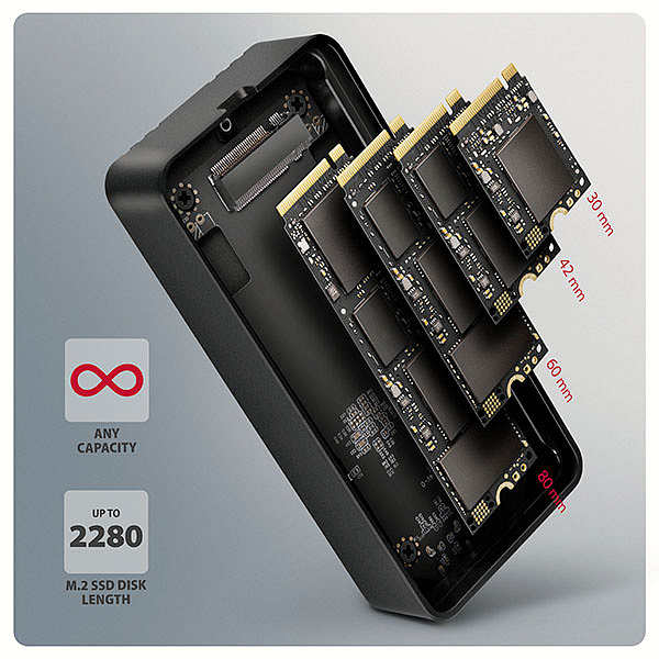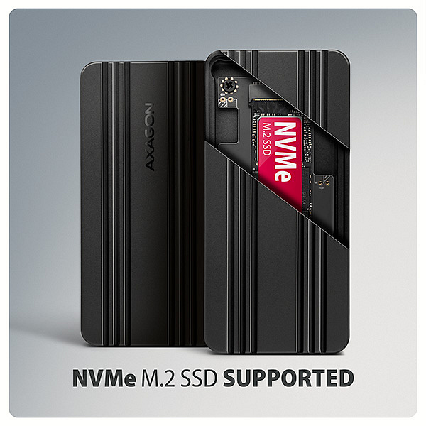 Box je určen pro M.2 NVMe SSD disky. Podporuje formáty 2230, 2242, 2260 a 2280 mm v jednostranném i oboustranném provedení, bez omezení kapacity (včetně disků s kapacitou 4 TB a vyšší). Podpora UASP napomáhá efektivnějšímu přenosu dat, zatímco funkce TRIM pomáhá udržet výkon SSD disku v průběhu času. Možnost čtení S.M.A.R.T. informací pak umožňuje sledovat stav disku.