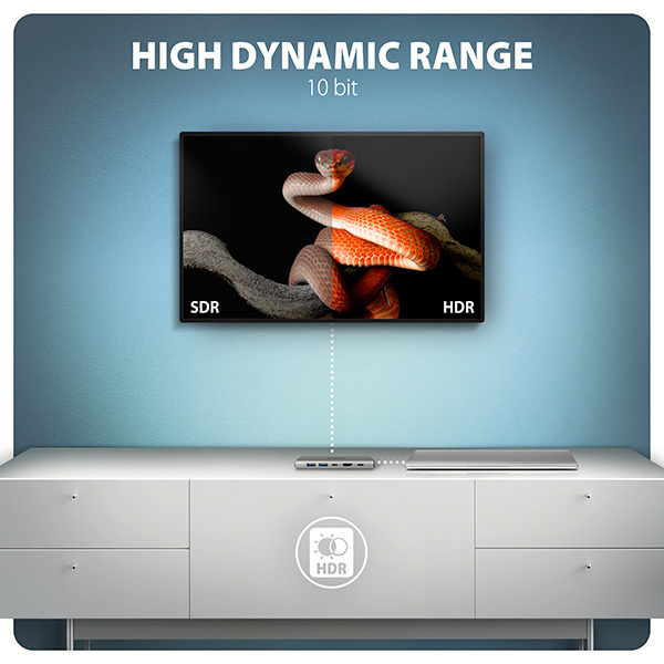 Výstup HDMI poskytuje vysokokvalitný obraz až do rozlíšenia 4K/60Hz Ultra HD a podporuje viackanálový prenos zvuku. Podporované sú aj vysoké frekvencie v obľúbených herných rozlíšeniach 2K/120Hz alebo FullHD/240Hz. Vďaka podpore HDR (High Dynamic Range) si môžete vychutnať výrazne rozšírenú škálu farieb a kontrastov bez obmedzení. Aby video výstup fungoval správne, musí mať prenosný počítač port USB-C s podporou alternatívneho režimu DisplayPort (DP Alt Mode) alebo port Thunderbolt 3, 4 a vyšší.