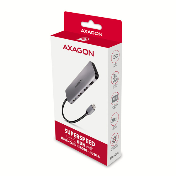 Viacportový USB-C 3.2 Gen 1 hub AXAGON HMC-HCR3A rozšíri váš notebook, počítač alebo telefón o štyri porty a čítačku pamäťových kariet SD/microSD. Prostredníctvom obojstranného USB-C konektora ľahko a rýchlo pripojíte k počítaču súčasne tri USB zariadenia, pamäťové karty a HDMI displej. Rozbočovač USB-C vám poskytne jednoduchú a kompaktnú dokovaciu stanicu 5 v 1 pre váš notebook.