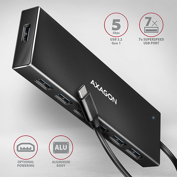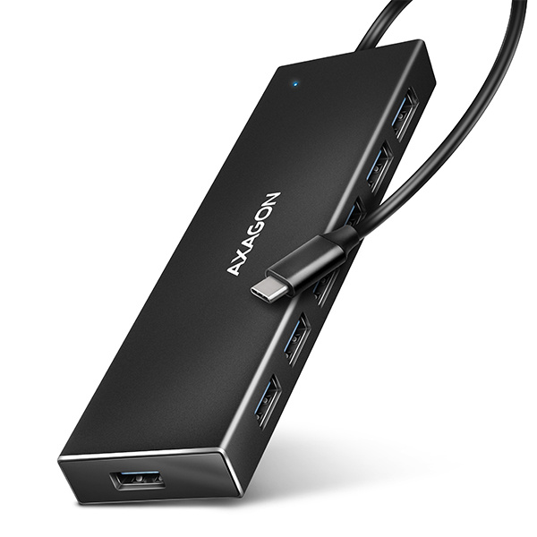 Tenký rozbočovač USB-C 3.2 Gen 1 (USB 3.0) AXAGON HUE-F7C s 1,2 m dlhým USB káblom ľahko a rýchlo pripojí k notebooku až sedem USB zariadení súčasne. Štandard USB 3.2 Gen 1 umožní prenosové rýchlosti až 5 Gb/s.