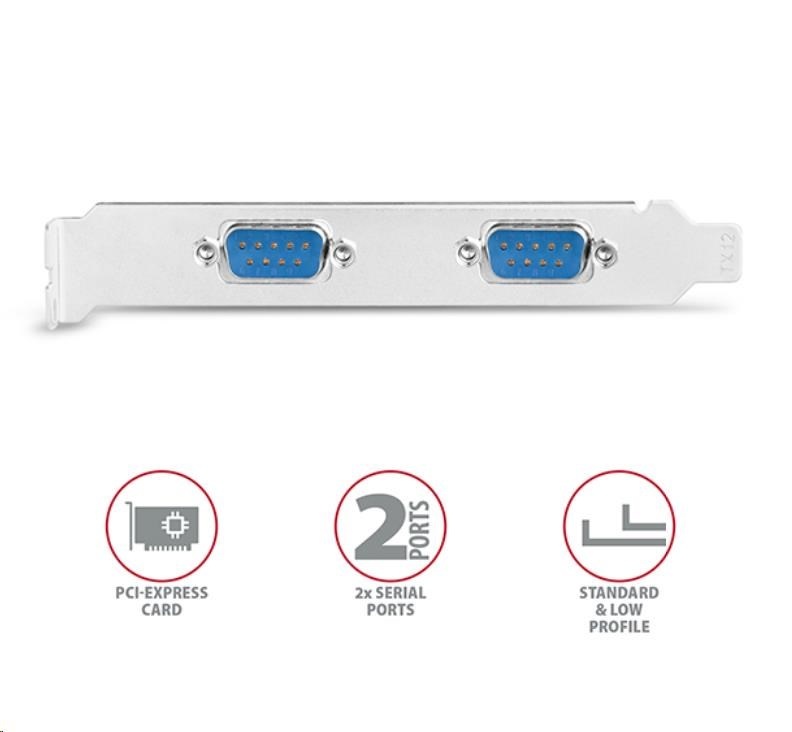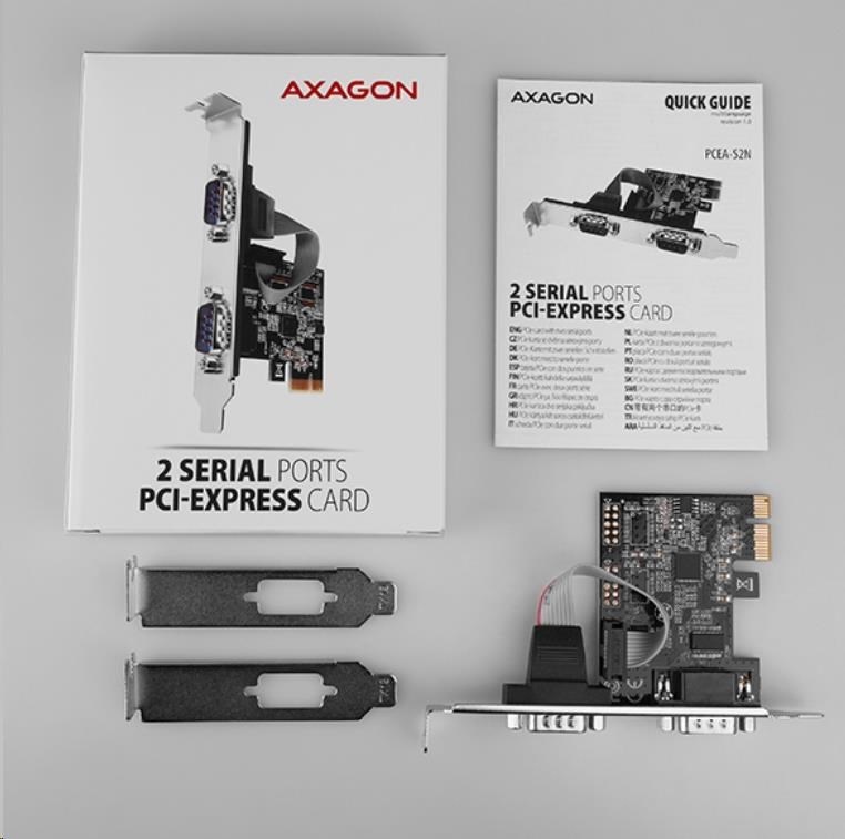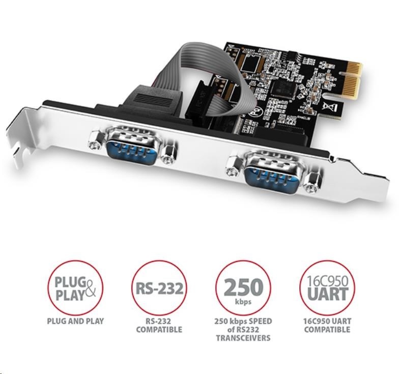 Popis AXAGON PCEA-S2N, PCIe radič - 2x sériový port (RS232) 250 kbps, vrátane. LP