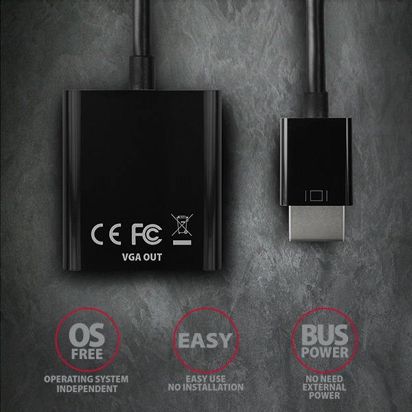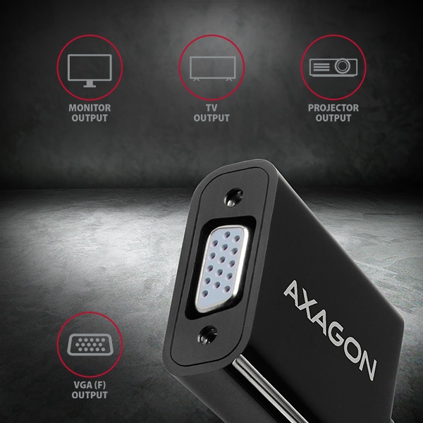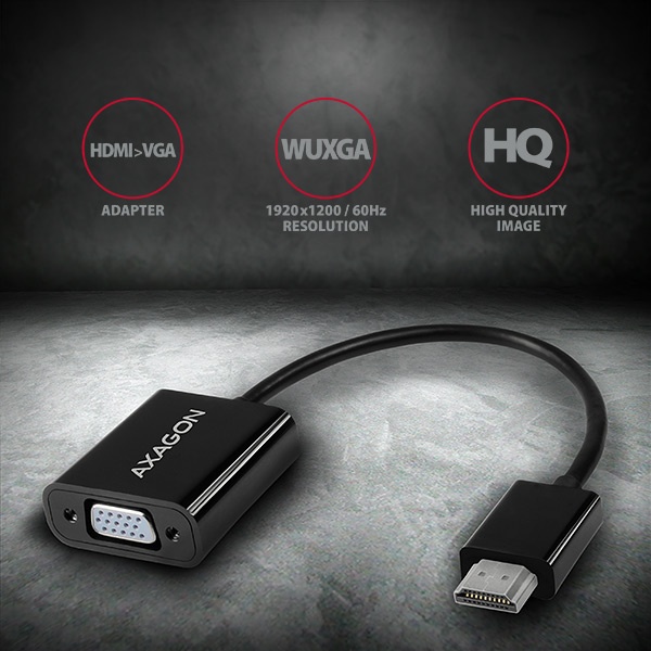 HDMI -> VGA aktívny adaptér AXAGON RVH-VGN pre pripojenie staršieho VGA monitora/TV/projektora k počítaču alebo inému zariadeniu s výstupom HDMI. Redukciu je možné použiť aj so set-top boxy alebo hernými konzolami Xbox a PlayStation.