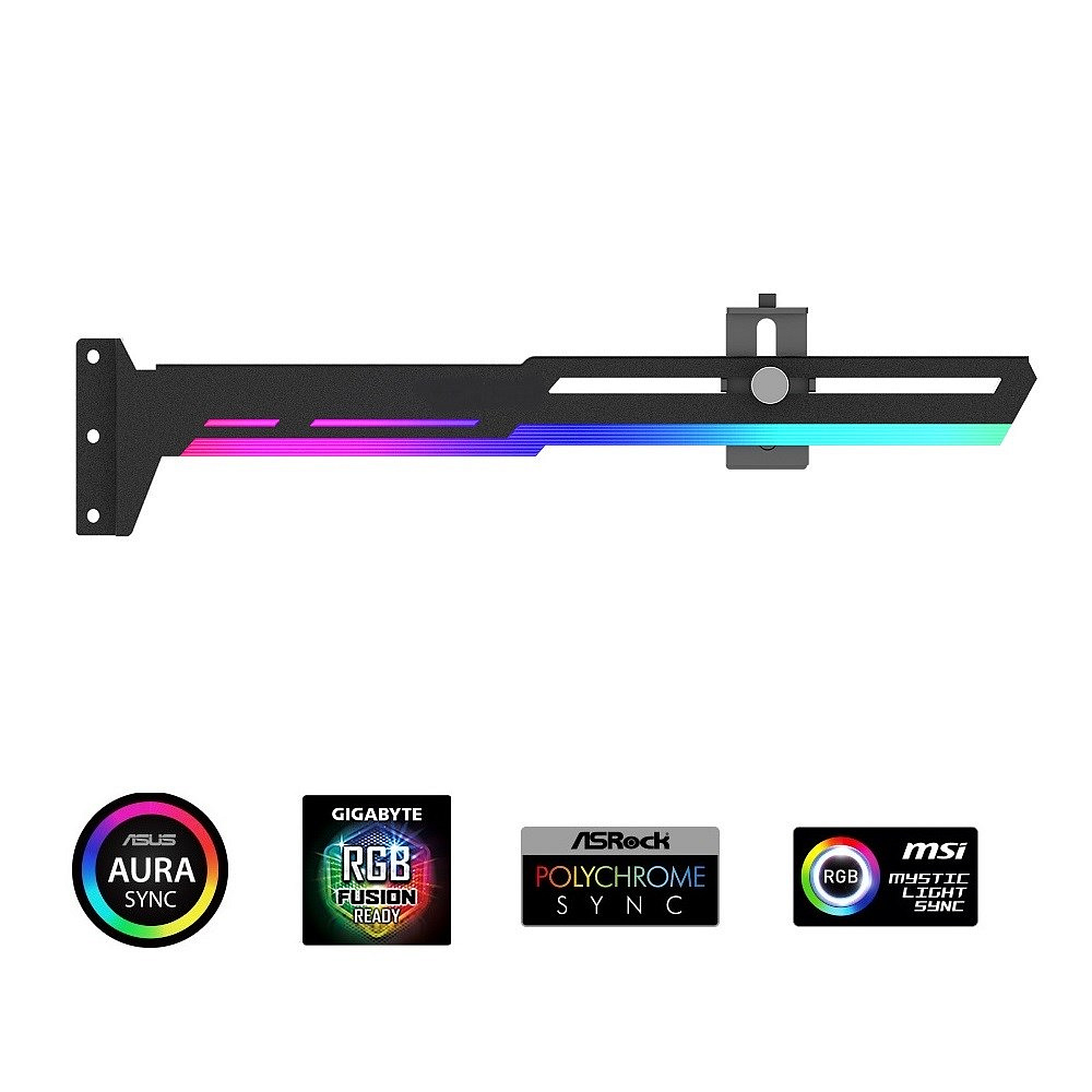 Štýlová varianta tejto opory vašej grafickej karty je vyrobená z oceľového práškového lakovaného plechu a plastu, zabraňuje prehnutiu väčších kariet v slotu a dodáva tak zostave lepšiu celkovú stabilitu. Súčasťou je silikónová posuvná opora, ktorú je možné posunúť horizontálne aj vertikálne a umožňuje inštaláciu na rôznych miestach karty, pre maximálnu kompatibilitu s väčšinou kariet. Rozmery držiaku sú 280 x 52mm.