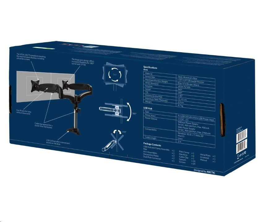 The ARCTIC Z2-3D (Gen 3) monitor arm supports the latest ultrawide monitors (up to 29 inches) with ease. Classic 16:9 monitors are also compatible (up to 34 inches). The Z2-3D (Gen 3) supports monitors with 8 kg/17.6 lbs per arm.