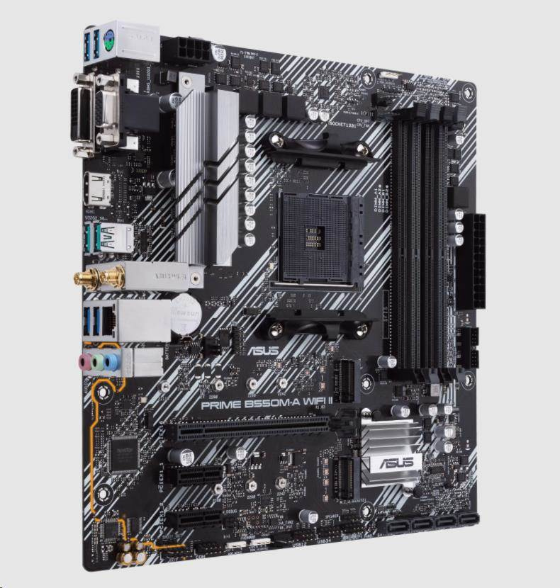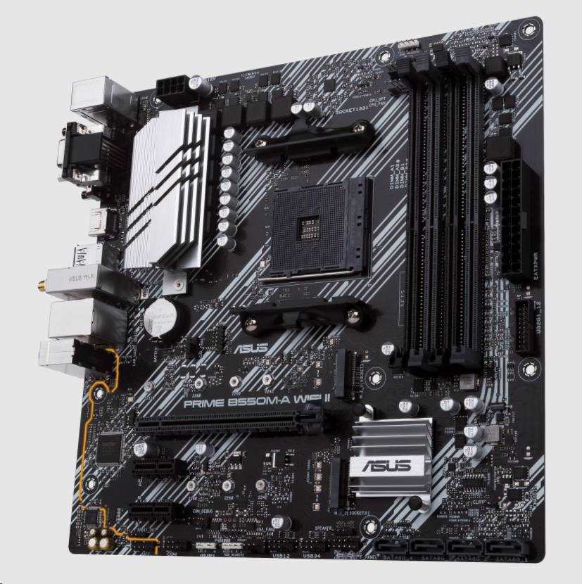 AMD B550 (Ryzen AM4) micro ATX motherboard with dual M.2, PCIe 4.0, Wi-Fi 6, 1 Gb Ethernet, HDMI, DVI-D, D-Sub, SATA 6 Gbps, USB 3.2 Gen 2 Type-A, and Aura Sync RGB lighting support