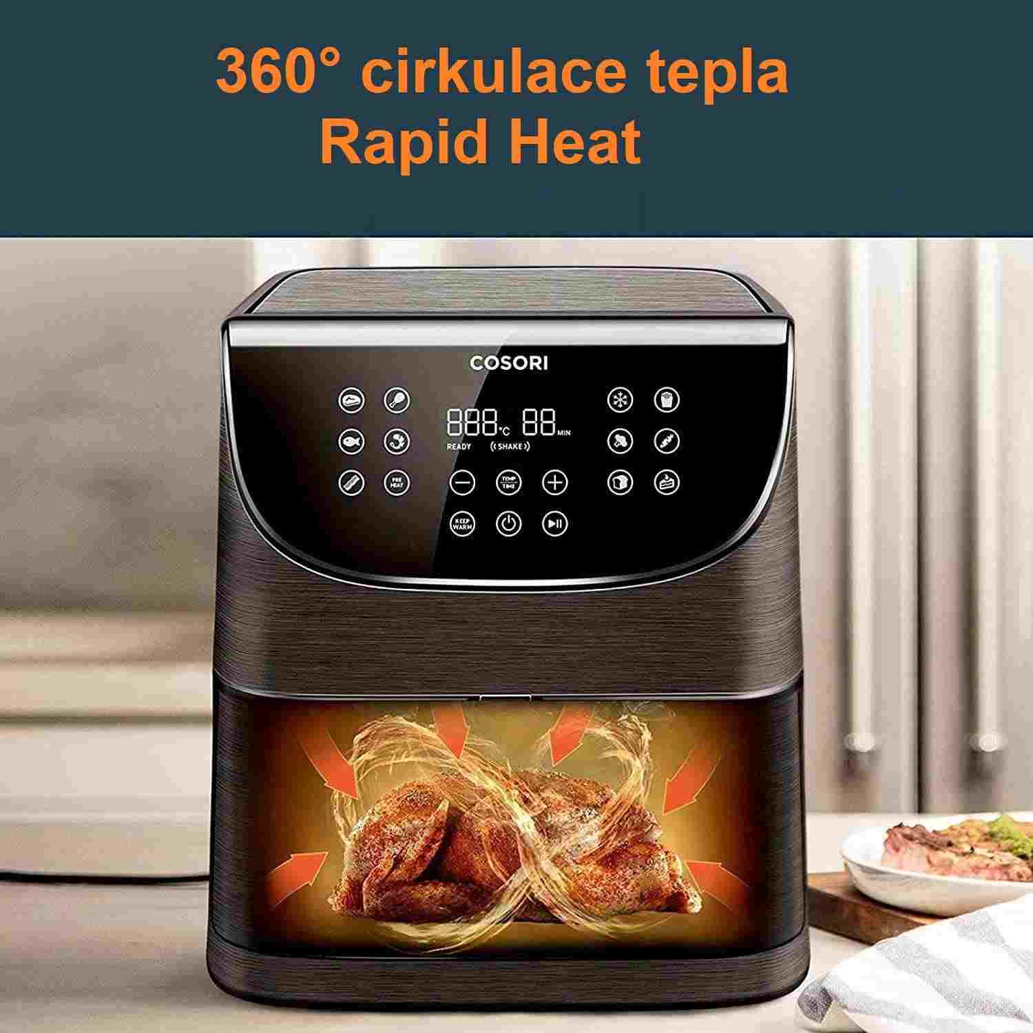 Teplovzdušná fritéza COSORI CP158-AF má 6l varný priestor a 5,5l kôš s praktickým štvorcovým tvarom, vďaka čomu uspokojí aj početnejšie domácnosti. S výkonom 1700 W je fritéza extrémne výkonná, čo skracuje dobu varenia a šetrí tak elektrickú energiu. Vďaka veľkosti varného priestoru fritézy je možné pripraviť napríklad aj celé 3kg kura v kuse, ktoré by sa do fritézy s kruhovým košom alebo objemom 3-4l zmestilo len veľmi ťažko.