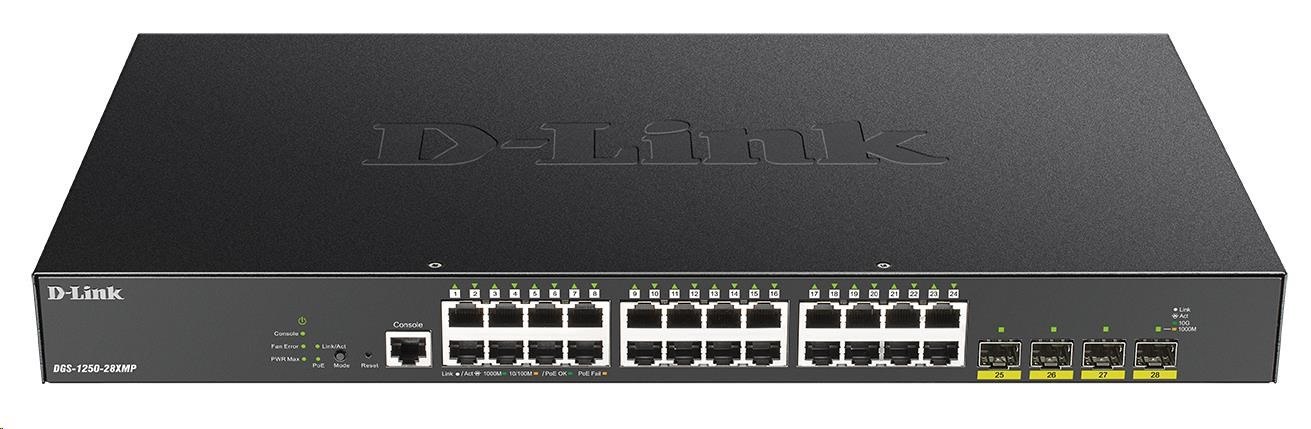 Popis BAZAR - D-Link DGS-1250-28XMP 28-port Gigabit Smart PoE Switch, 24x GbE PoE+, 4x SFP+, PoE 370W - Poškozený obal (Komple