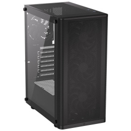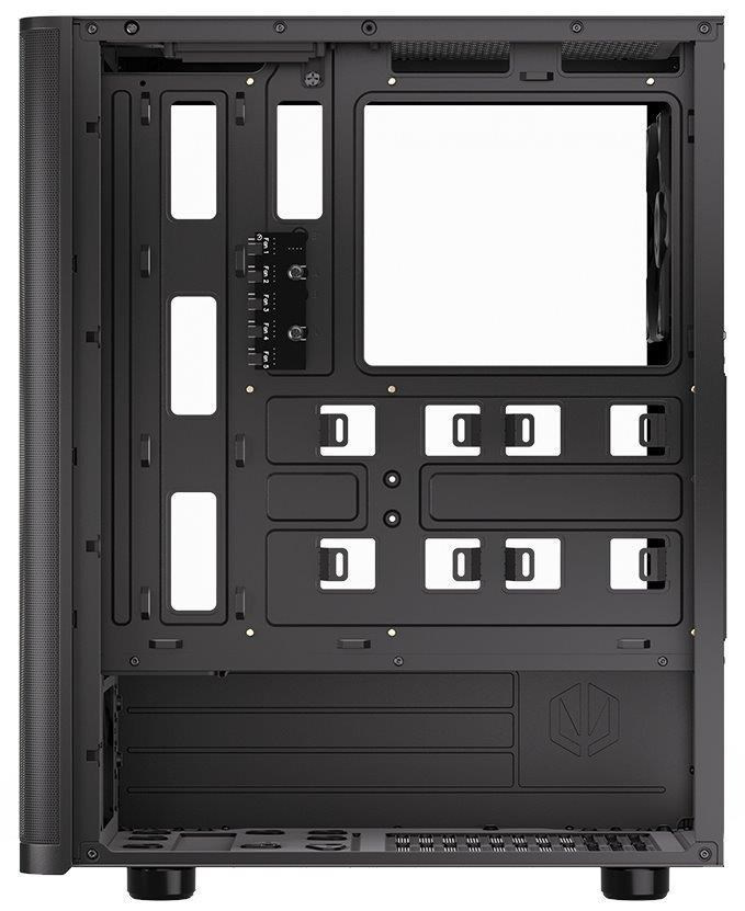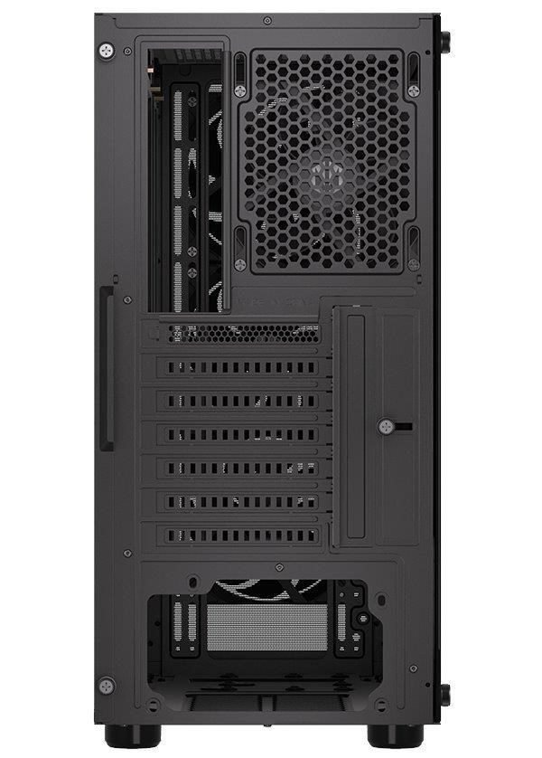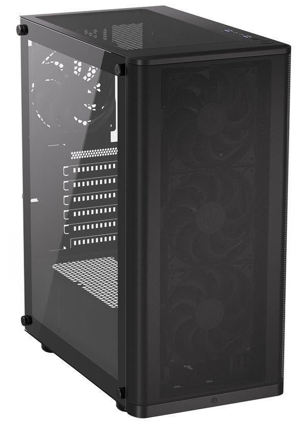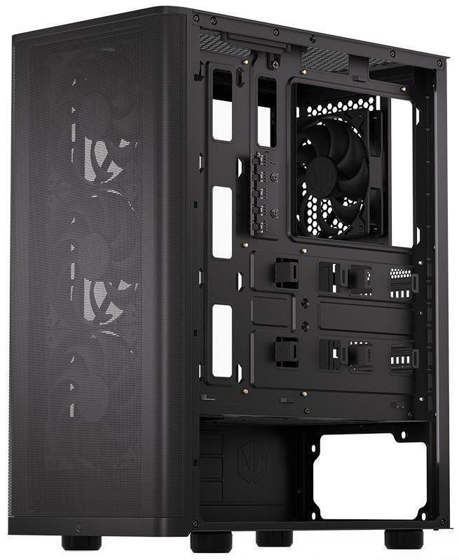Skriňa formátu Middle Tower s priehľadnou bočnicou z tvrdeného skla ponúka dve 2,5" pozície pre SSD disky a jednu 3,5" pozíciu pre pevný disk. Na hornom okraji sa nachádza dva USB 3.0 porty, slúchadlový výstup a audio vstup pre mikrofón. Vybavená je štyrmi 120 mm ventilátormi, ktoré spolu s perforovaným čelným panelom zabezpečujú dostatočné prúdenie vzduchu. Promyšlené riešenie umožňuje pohodlné umiestnenie az 360 mm dlhého výmenníka vodného chladenia na prednej strane. Vo skrini je dostatok priestoru pre chladič CPU do výšky až 161 mm a grafickú kartu s dĺžkou až 315 mm. Dodáva sa bez zdroja. Súčasťou je tiež sada prachových filtrov.