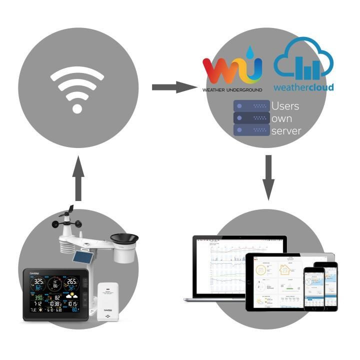 ty pomocí místní Wi-Fi sítě v reálném čase nahrává na zvolený server/servery Weather Underground (https://www.wunderground.com) a Weathercloud (https://weathercloud.net/en),