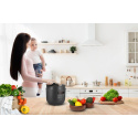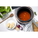 Elektrický tlakový hrniec už nie je strašiakom, po skončení programu jednoducho vypustíte bezpečne tlak pomocou One Touch ventilu. Spracovanie prístroja v originálnom prémiovom High end dizajne zaručuje nielen tú najvyššiu kvalitu použitých materiálov, ale aj veľmi ľahkú údržbu vďaka nepriľnavému povrchu vnútorného hrnca s objemom 5 l. Začiatky s novým spotrebičom uľahčí inšpiratívna kuchárka s ôsmimi zdravými receptami, ktorá je súčasťou balenia.