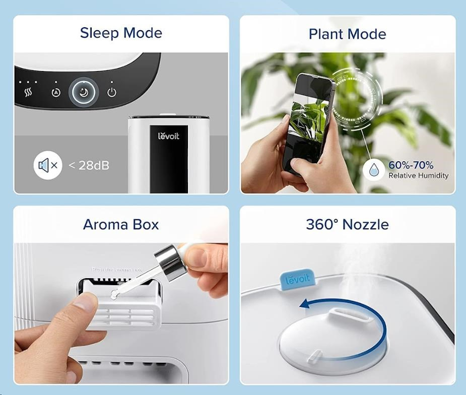 Prevádzka je veľmi tichá a nebude vás rušiť ani pri spaní. Budete môcť nerušene snívať a zvlhčovač Levoit OasisMist Smart sa postará o kvalitu a vlhkosť vzduchu v miestnosti podľa vašich predstáv. Hlučnosť v prevádzke je iba 28 dB.