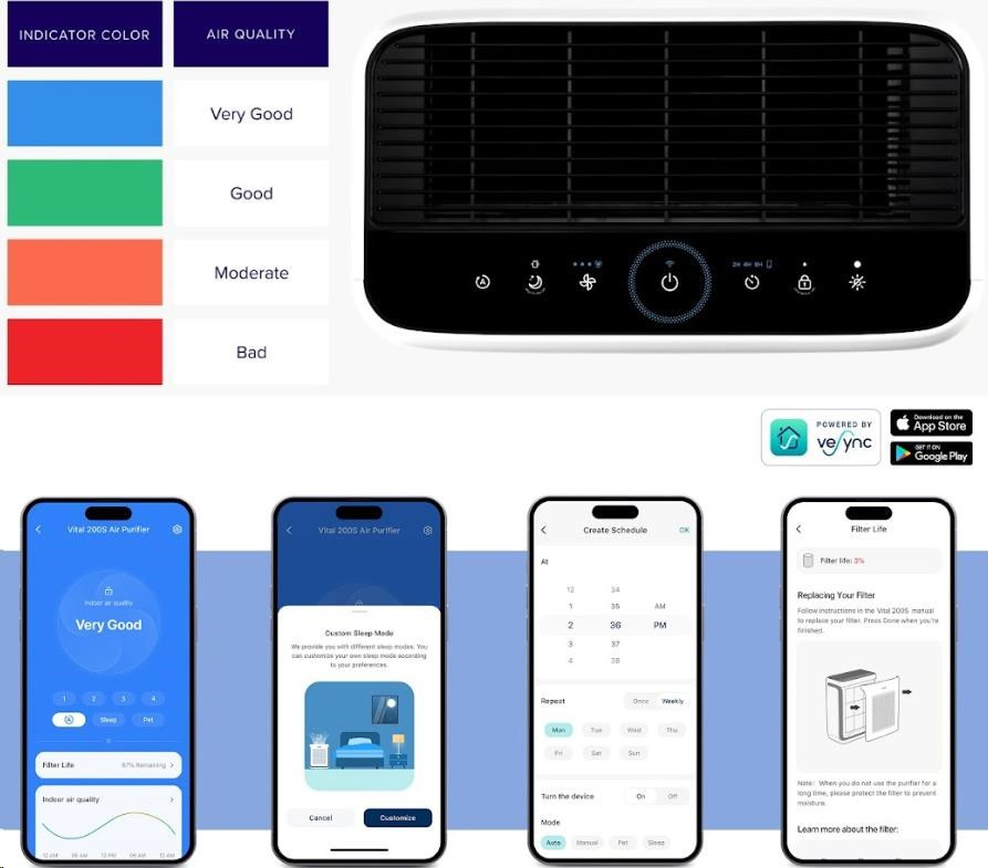 Chcete mať doma čistý vzduch ako prevenciu pred ochorením horných dýchacích ciest alebo ste alergik či astmatik? Chytrá čistička Levoit Vital 100S vďaka vysoko kvalitnej 3-vrstvovej filtrácii s filtrom HEPA H13 a omývateľným predfiltrom odstráni až 99,97% škodlivých látok a nečistôt, ktoré by ste inak dýchali. Čistička Levoit Vital 100S je certifikovaná pre alergikov a disponuje výkonom 243 m3/h CAD pri 32W. Vďaka energeticky nenáročnému prevádzke získala ocenenie Energy Star. Ovládanie čističky vzduchu je naozaj jednoduché priamo na displeji alebo sa dá ovládať cez aplikáciu na chytrých zariadeniach Android alebo Apple (iOS). Levoit Vital 100S je vybavená senzorom snímania kvality vzduchu, na základe ktorého vie sama chytro upravovať výkon čistenia.