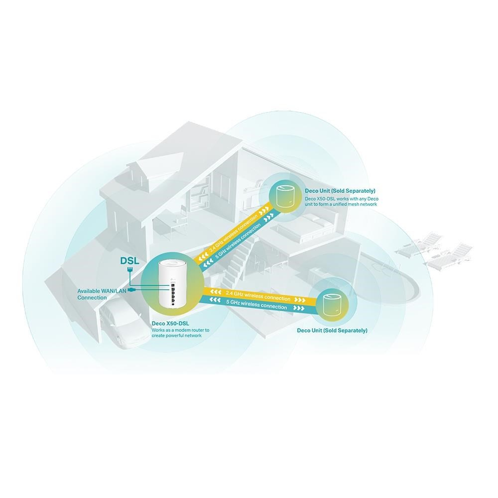 | Ethernetové porty | 4× Gigabitové porty na Deco X50-DSL jednotku Podpora automatického rozpoznania WAN/LAN |