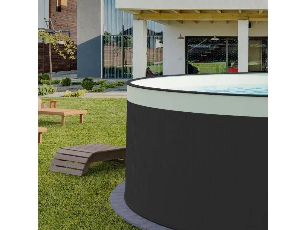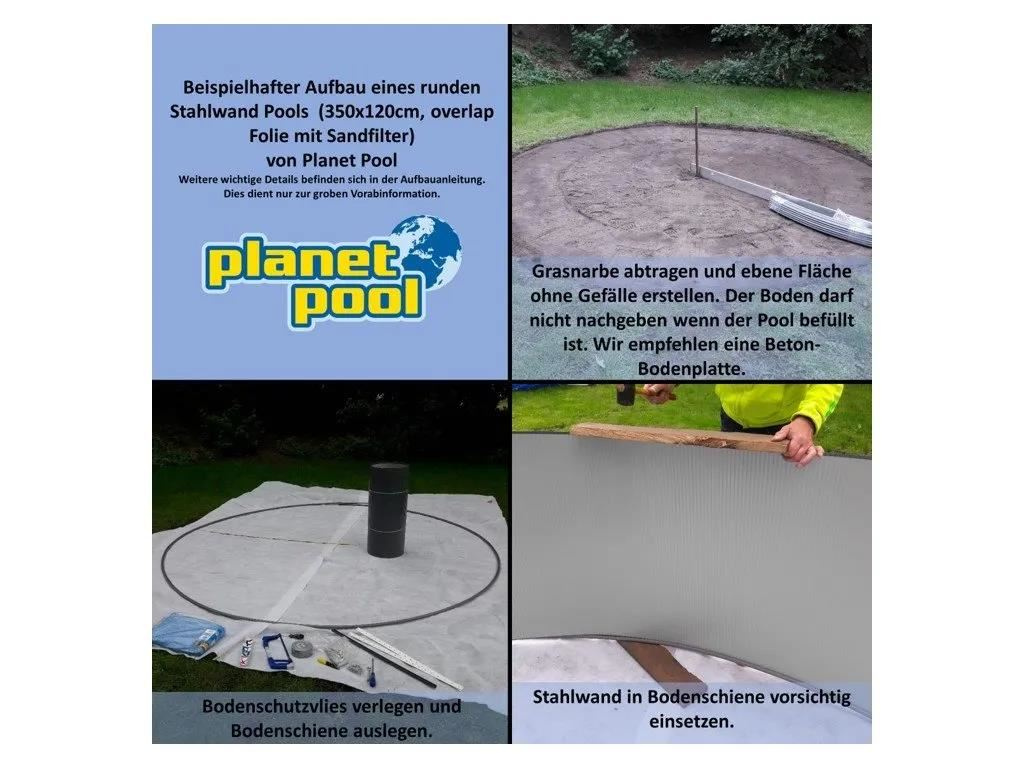 Nadzemné bazény Planet Pool s oceľovou stenou sú určené na celoročné používanie. Odpadá tak potreba bazén demontovať na jeseň a znova inštalovať na jar ako u sezónnych bazénov s nafukovacím límcom či rámovou konštrukciou. Vďaka žiarovo pozinkovanej a nátierkou ošetrenej oceľovej stene a mrazuvzdornej fólii je bazén pripravený na všetky rozmary prírody. Tento bazén je veľmi stabilný, pevný s dlhodobou životnosťou. Moderná ANTRACITOVÁ nátierka steny bazénu + PIESKOVÁ PVC závesná fólia. Bazén je vhodný na inštaláciu na rovnom podklade s dostatočnou vzdialenosťou od potenciálneho spadu nečistôt zo stromov a strechy. UV stabilizácia PVC fólie zabezpečuje jej farebnú stálosť a životnosť. Tento bazén predstavuje osvedčenú koncepciu bazéna a pozitívnu historickú skúsenosť. Bazén sa inštaluje pomocou spodných a horných líšt, do ktorých sa zasúva oceľová stena. Oba kraje steny sa prepoja pomocou vnútorných a vonkajších líšt a skrutiek. Mrazuvzdorná fólia sa pomocou zalomenia k hornej časti oceľovej steny zavestí a tvaruje do bazéna podľa vizuálnych požiadaviek. Fólia je flexibilná a na mieru vyrobená pre tento typ bazéna (nie je potrebná žiadna úprava). Pre montáž krok za krokom sledujte pokyny v montážnom návode. Parametre: Tvar bazéna: guľatý tvar Rozmery bazéna: 350 x 90 cm Oceľová stena: 0,3 mm UV stabilizovaná PVC fólia, hrúbka 0,2 mm, farba PIESKOVÁ Farba bazéna: ANTRACITOVÁ Dierovanie pre štandardný vestavný skimmer a spätnú trysku dostupné Horná a podlahová lišta z plastu Bazén zodpovedá európskej norme pre bazény EN 16562-2