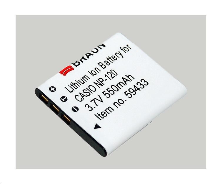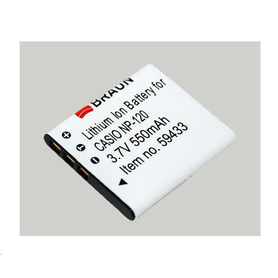 Li-Ion akumulátor Braun BDP-CNP120 (D111, CASIO NP-120 - 3,7 V/550 mAh) pre digitálne fotoaparáty CASIO Exilim ZS10, ZS12, ZS15, ZS20, ZS26, ZS27, ZS30, ZS35. Tento akumulátor je dodávaný v čiastočne nabitom stave. Pred použitím je vhodné akumulátor nabiť. Plná kapacita akumulátora môže byť dosiahnutá až po cca 4-5 nabíjacích cykloch.