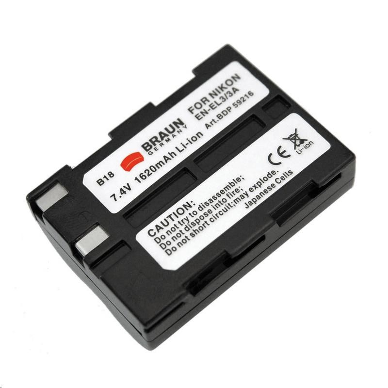 Li-Ion akumulátor Braun BDP-NEL3 (D17, NIKON EN-EL3/EL3a - 7,4 V/1620 mAh) pre digitálne fotoaparáty NIKON D50, D70, D70s, D100. Tento akumulátor je dodávaný v čiastočne nabitom stave. Pred použitím je vhodné akumulátor nabiť. Plná kapacita akumulátora môže byť dosiahnutá až po cca 4-5 nabíjacích cykloch.