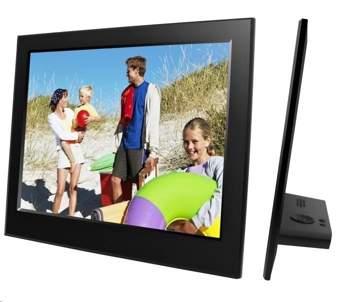 Digitálny fotorámik s uhlopriečkou 8", ultratenký 6,5 mm s opierkou, vysoké rozlíšenie 1280x800px, 16:10, Motion Senzor pohybu, prezeranie obrázkov vo formáte JPEG, posluch hudby MP3/WMA a prehrávanie videa Full HD MPEG1/2/4, multislot SD/MS a USB2 flash max 32GB, Audio out, Auto Start/ON/OFF, funkcie: SlideShow (prezentácia), náhľady, zoom a otáčanie obrázkov, budík, hodiny, kalendár. Rozmer: 220x176x23 mm, hmotnosť 440 g. Súčasťou dodávky sieťový zdroj AC/DC 5V/1,5A, diaľkové ovládanie.