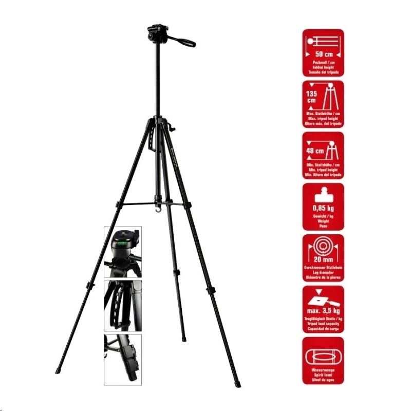 Lehký hliníkový foto/video statív, 3-smerová hlava s výmennou doskou, vodováha, 3 segmenty nôh so svorkami, profil 20mm, zaťaženie maximálne 3,5kg, rozmery: zložený 50cm / výška 48-135cm, hmotnosť 850g, farba čierna, vrátane puzdra. Stredový stĺpik so vzperami pre vyššiu stabilitu, nastavovanie výšky kľúčom, háčik na zavesenie príslušenstva alebo závažia, plastová uška pre transport, nohy ukončené gumou.