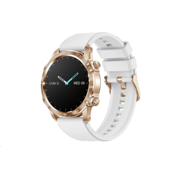 Moderné outdoorové fitness hodinky CARNEO ADVENTURE HR+ druhej generácie v zlatoružovej farbe s bielym, na dotyk veľmi príjemným silikonovým remienkom a farebným SUPER AMOLED displejom s vysokým jasom a funkciou trvalého zobrazenia času monitorujú vašu dennú aktivitu, úroveň stresu, ale je možné ich spárovať s mobilným telefónom a upozorniť vás na prichádzajúci hovor alebo SMS. Hodinky umožňujú telefonovať, aniž by ste museli vybrať telefón z tašky, vďaka vstavanému mikrofónu a reproduktoru až do vzdialenosti 10 m od telefónu. Ich bezchybné kovové telo s nadčasovými outdoorovými krivkami je tak návykové, že ich po prvom nosení nebudete chcieť sundávať zo zápästia. Extrémne odolné sklo Gorilla glass ochráni ich krištáľovo čistý displej pred poškriabaním.