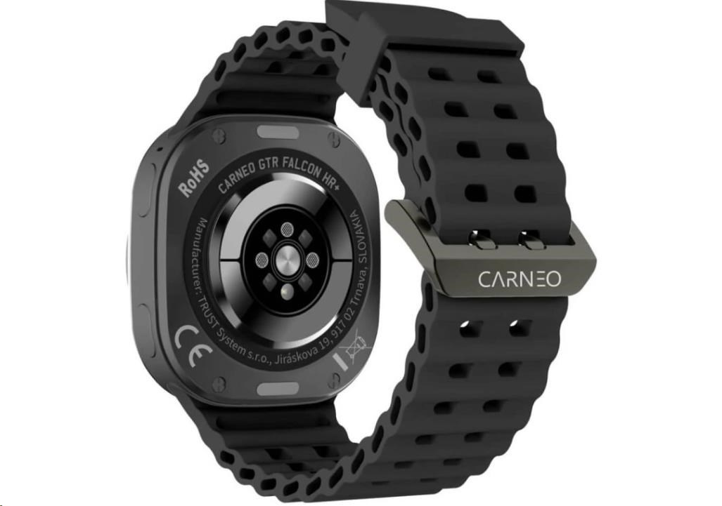 CARNEO GTR Falcon HR+ sú moderné fitness hodinky v elegantnom metalicky čiernom prevedení so silikónovým remienkom, ktorý je príjemný na dotyk. Farebný SUPER AMOLED displej s vysokým jasom a funkciou always-on zobrazenia poskytuje vynikajúcu čitateľnosť aj na priamom slnku.