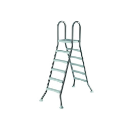 Bazénový rebrík pre bazény so stenou až 150 cm, vyrobený z kvalitnej nerezovej ocele, ktorá zabezpečí jeho dlhú životnosť. Rebrík má silné stabilné plastové stupnice a plošinu s protisklzovou úpravou, unesie hmotnosť až 150 kg. Rebrík má 5 stupňov na vnútornej a vonkajšej strane. Nohy rebríka sú zakončené koncovkami z protisklzovej gumy so stabilnou podložkou, ktoré zabraňujú nechcenému pohybu rebríka a zvyšujú tak bezpečnosť. Zároveň zabraňujú poškodeniu vášho bazéna.