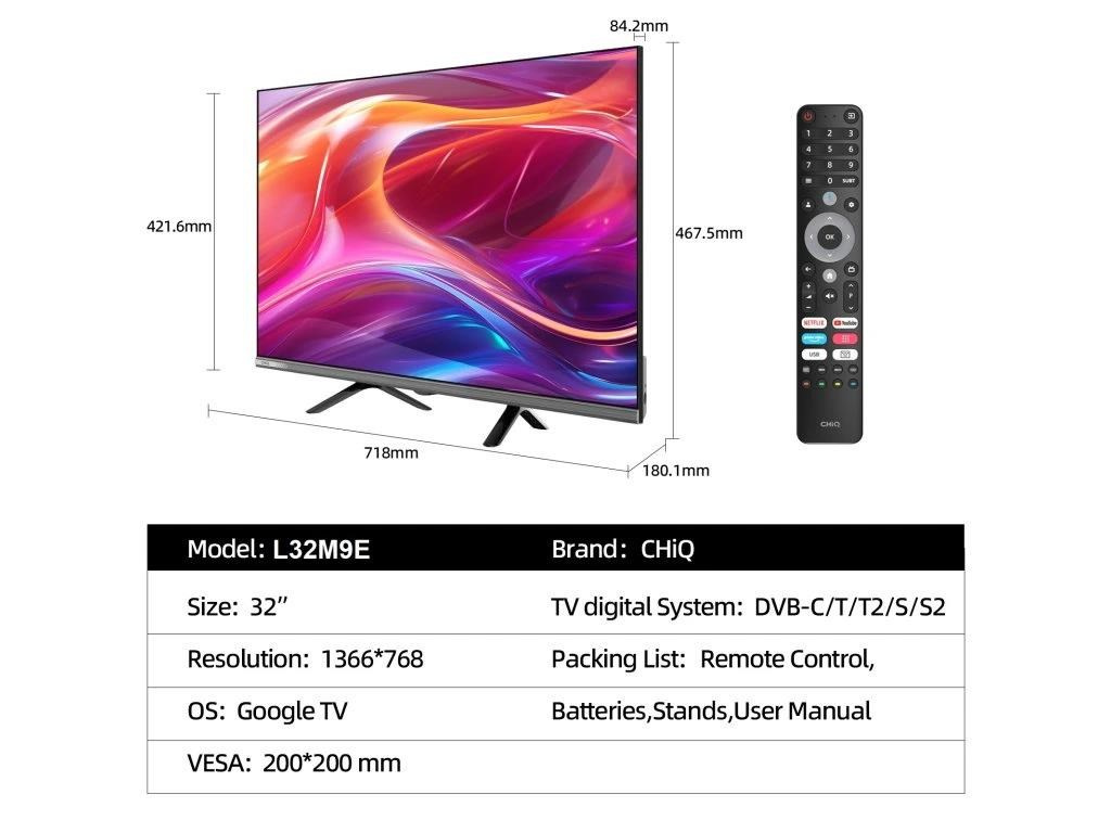 CHiQ 32“ L32M9E, kovová bezrámečková Smart Google TV s HDR10, HLG, HD obrazovkou s rozlíšením, Dolby Audio a vylepšeným zvukom dbx-tv.