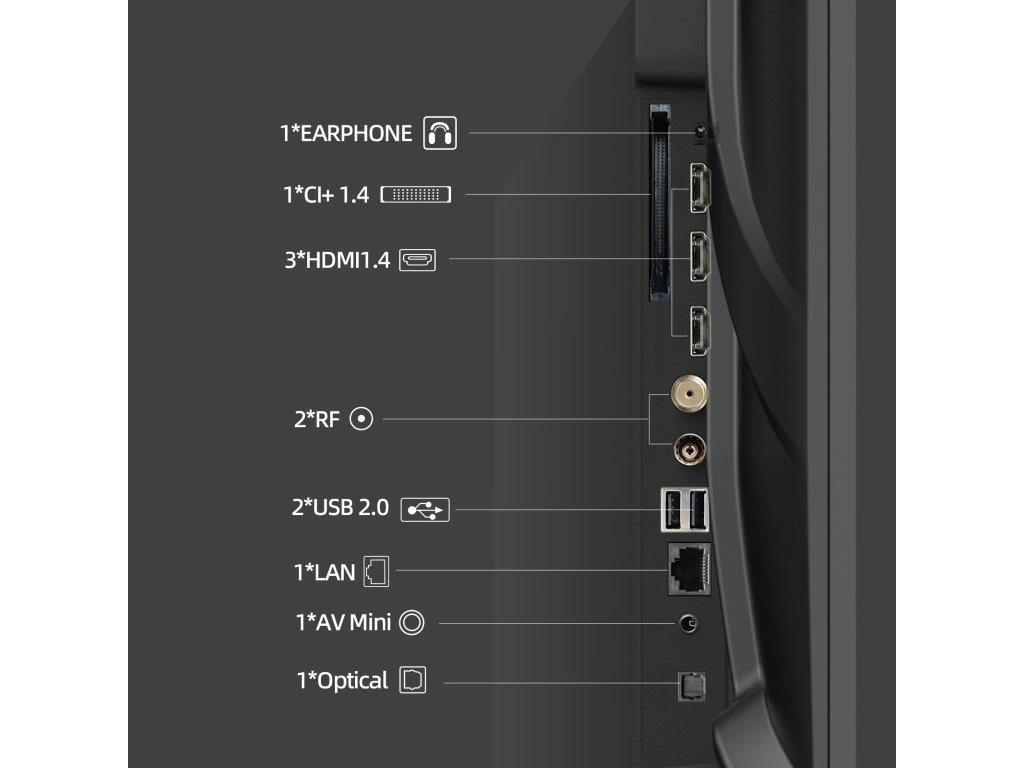 Vstupy a výstupy: AV vstup mini, CI+, slúchadlový vstup 3.5 mm, digitálny audio výstup, HDMI 1.4, USB 2.0, LAN, antény RF a LNB