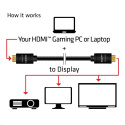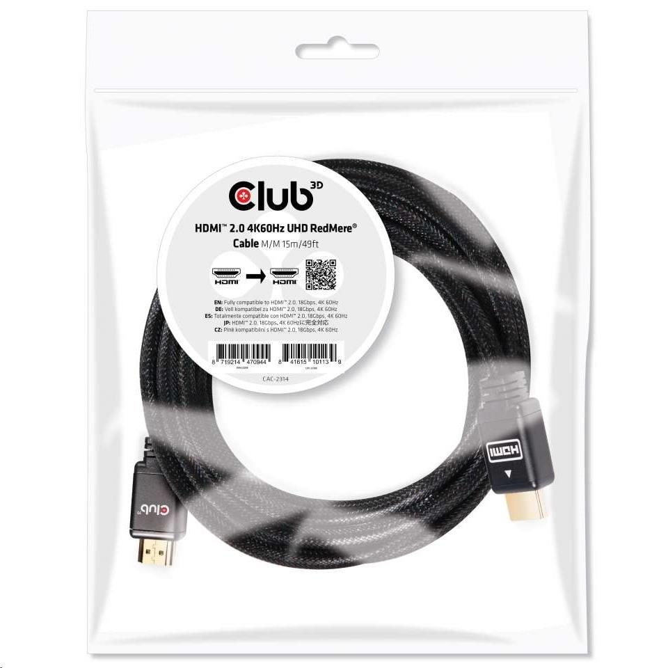 Kábel Club 3D HDMI ™ 2.0 4K60Hz UHD RedMere® umožňuje pripojenie vášho herného PC alebo notebooku, ktoré obsahujú port HDMI ™, k (U)HD monitoru alebo inému zariadeniu s rozhraním HDMI. I keď, je kábel dlhý 15 metrov, plne podporuje rozhranie HDMI ™ 2.0 so špecifikáciou Ethernet, čím je zaistená podpora videa až v 4K UHD, 4096x2160p pri 60Hz, rovnako tak zvukové a dátové toky.
