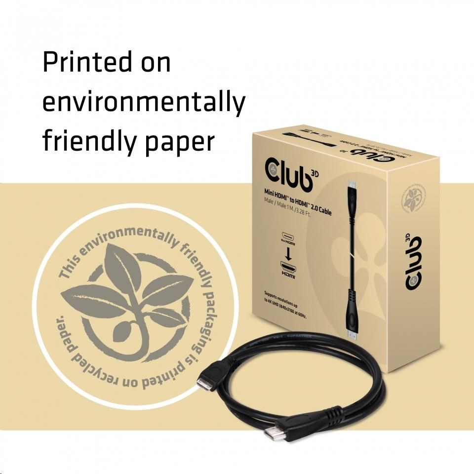 Kábel Club 3D Mini HDMI ™ to HDMI ™ 2.0 poskytuje rozlíšenie UHD signálu pre jasný, prirodzený obraz a zvuk. Umožňuje pripojenie digitálneho fotoaparátu / videokamery, mini počítača, projektoru Pico alebo iného zariadenia s výstupom Mini HDMI ™ do televízoru 4K UHD, monitoru alebo projektoru s konektorom HDMI ™. Plne podporuje vysokorýchlostné rozhranie HDMI ™ s Ethernetom, čo zaručuje, že je podporované video až do 4K UHD 3840x2160p pri 60Hz, rovnako tak zvukové a dátové toky.