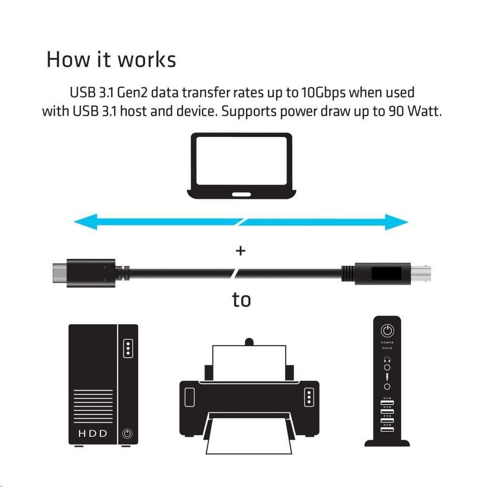 CAC-1524 Club 3D USB 3.1 Gen2 Type-C na Type-B Kábel umožňuje pripojenie bežných USB periférií, tlačiarní, externých pevných diskov, dokovacích staníc apod. so spoločným konektorom typu B k najnovším notebookom, tabletom a Ultrabookom s výstupom USB typu C.