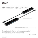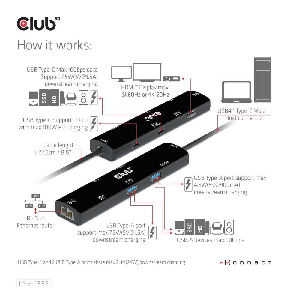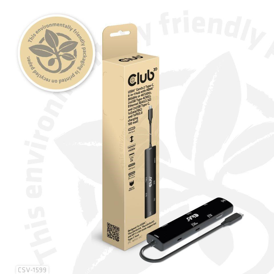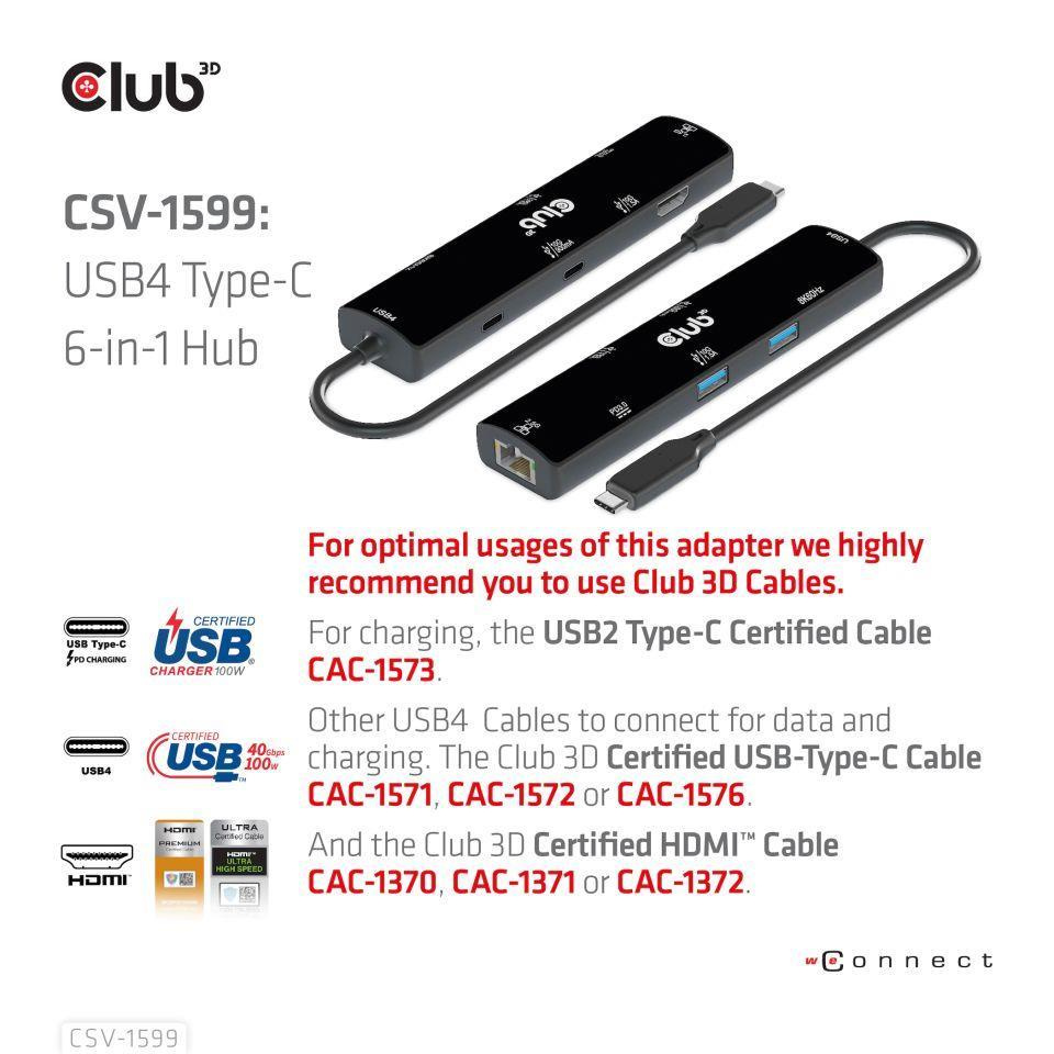 The Club 3D CSV-1599 is a USB4™ Gen3x2 Type-C, 6-in-1 Hub with HDMI™ 8K60Hz or 4K120Hz, 2xUSB Type-A(10G), Ethernet RJ45(2.5G) and 2xUSB Type-C, 1x Data(10G) and 1xPD3.0 charging 100 watt, this adapter is offering an integrated solution for video, data, power and Ethernet. It has a HDMI™(8K60Hz) for video transmission, 3 USB data ports (2 USB-A 10G, 1 Type-C 10G)for data transmission, a 2.5Gbps Ethernet port for surfing on line. Besides, this adapter is equipped with Type-C PD3.0 Charging port with max 100W power supply. It can work on USB4™, Thunderbolt4, Thunderbolt3 and DP Alt mode (15W is dedicated to the functioning of this product, the rest power(max 85W) will be passed to charge for the host. This 6-in-1 Hub will work on all DP Alt mode supported Type-C hosts.