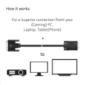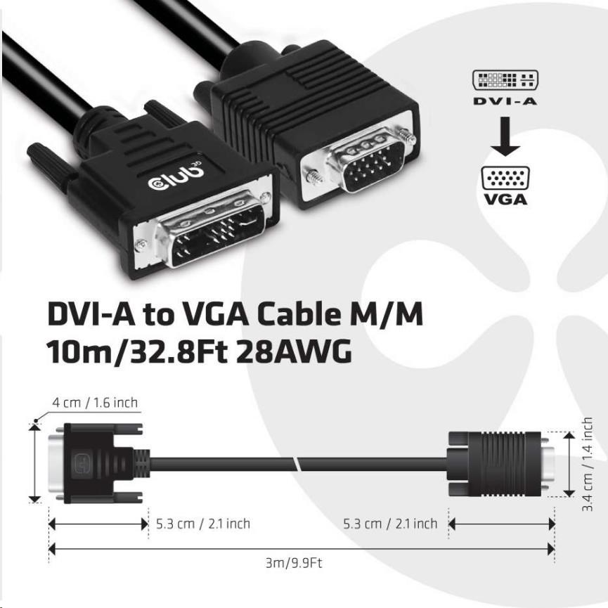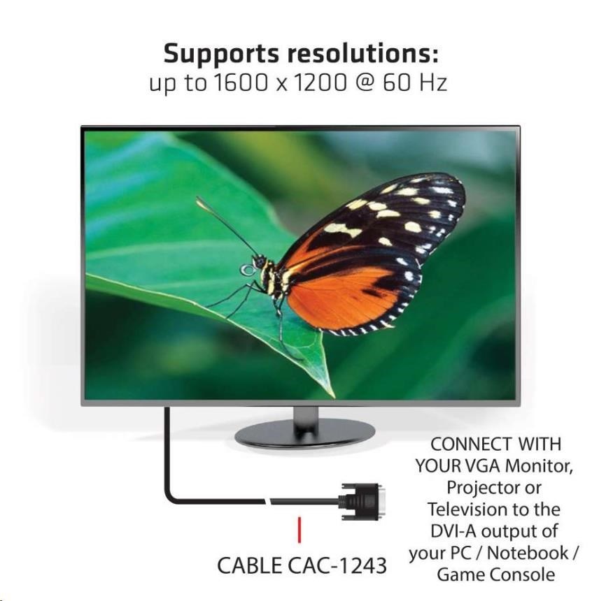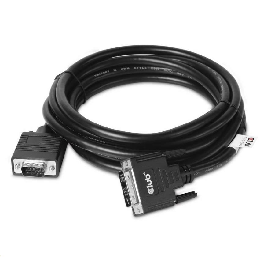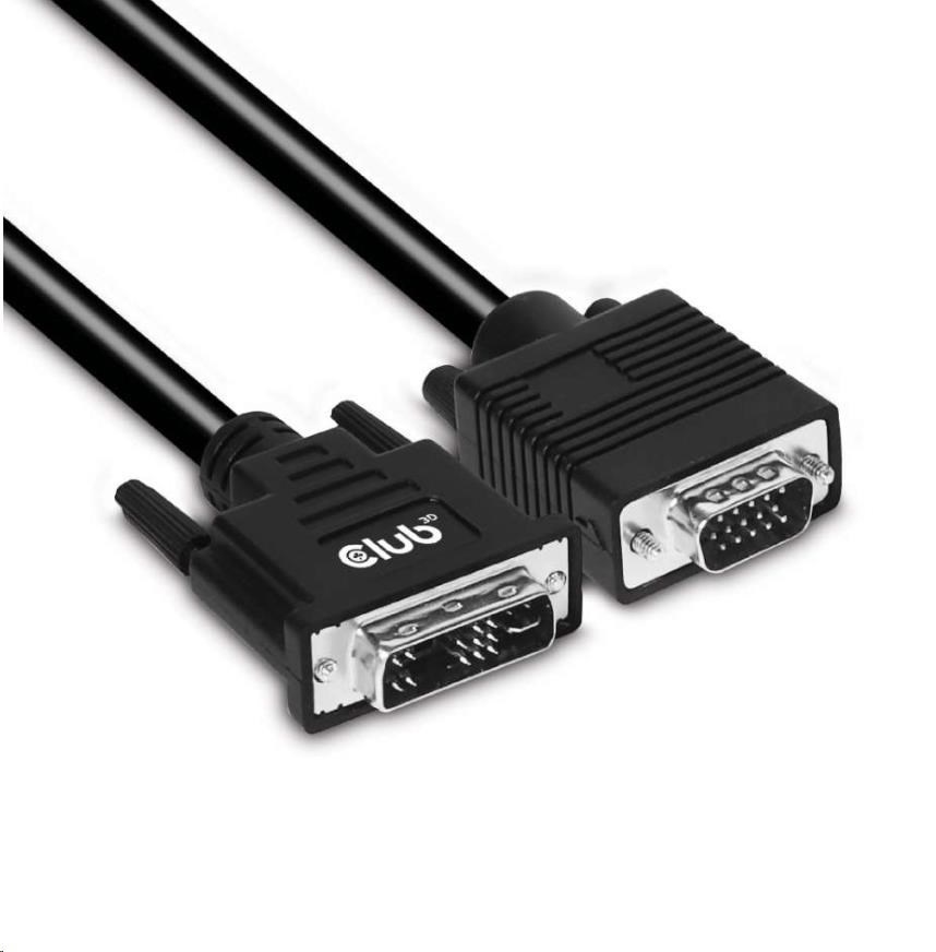 Club 3D CAC-1243 je kábel DVI-A samec na VGA samec. Tento kábel je jednosmerný. Tento kábel CAC-1243 je najjednoduchším riešením na pripojenie monitora VGA, projektora alebo televízora k výstupu DVI-A počítača/notebooku/hernej konzoly.