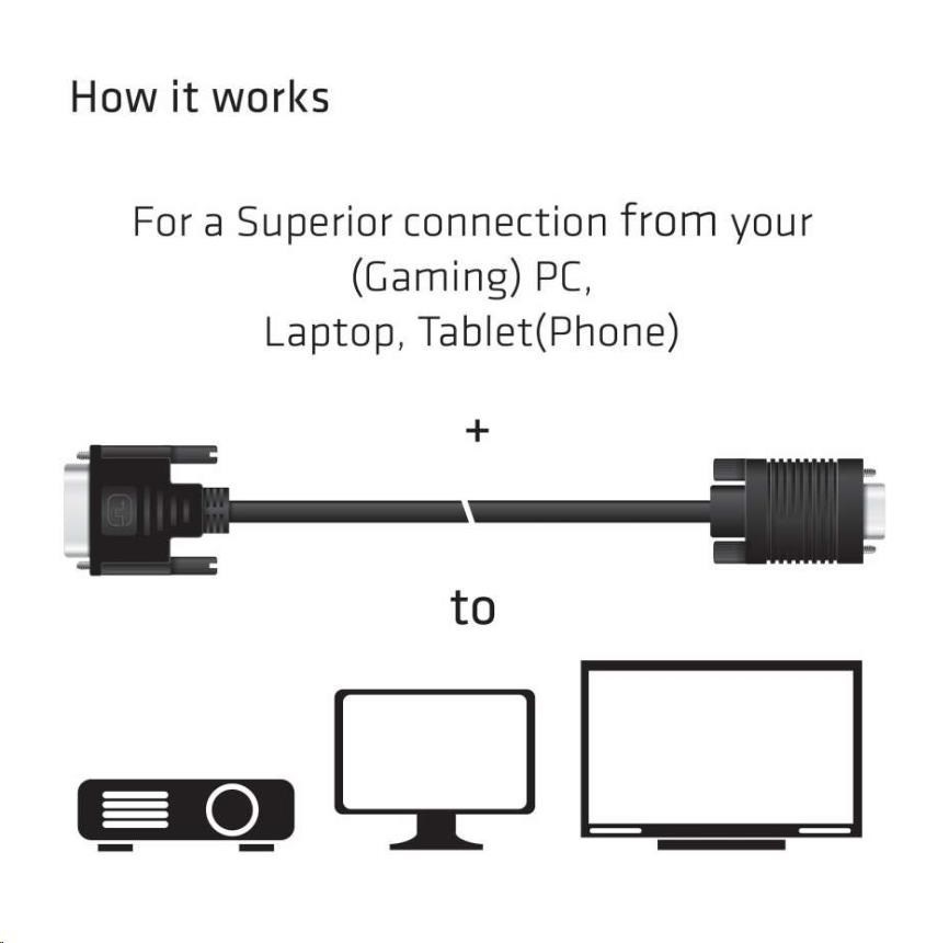 Na pripojenie k zariadeniam použite jeden z našich káblov VGA/DVI (predlžovací/adaptér): Ak potrebujete pomoc pri výbere správneho kábla, navštívte našu webovú stránku www.klub-3d.com alebo nám napíšte na support@club-3d.com a bude nám potešením vám pomôcť.