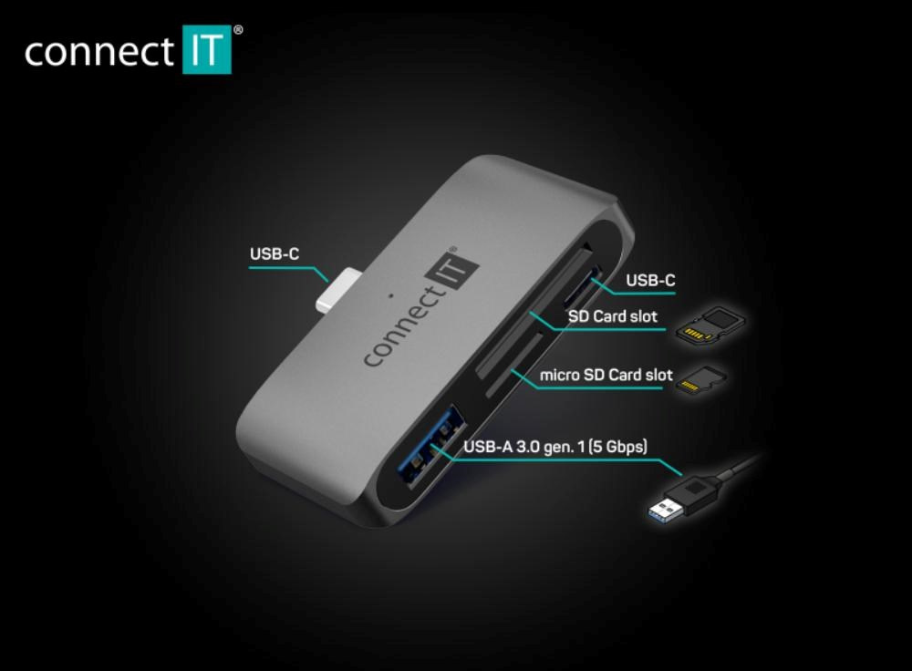 Praktická USB-C čtečka paměťových karet a USB hub CompactPRO umožňuje přenášet data a obsah mezi vašimi paměťovými kartami a mobilním telefonem či počítačem. Disponuje USB-C a USB-A 3.0 portem a sloty pro SD a MicroSD kartu.