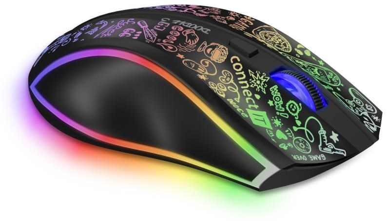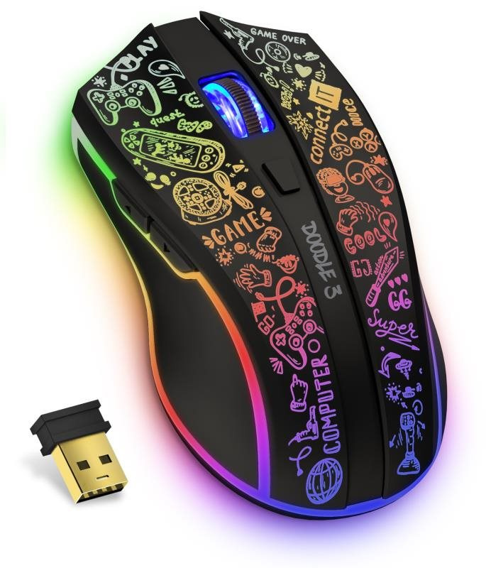 Profesionálna bezdrôtová herná myš DOODLE 3 pre hráčov PC s dúhovým podsvietením. Dodávaný softvér s množstvom nastavení podporuje používateľské makrá, 5 používateľských profilov a 6 programovateľných tlačidiel vrátane rolovacieho kolieska. Presný optický snímač má nastaviteľnú citlivosť až do 4800 DPI. Myš využíva technológie, ako je povrch RubberGrip, ktorý eliminuje šmykľavosť dlane, UltraSlides Black tracks pre maximálnu rýchlosť na podložke. K dispozícii je aj technológia AutoPowerSave na úsporu kapacity batérie. Softvér si môžete bezplatne stiahnuť na adrese www.connectit-europe.com. Pozlátený prijímač USB Nano a dodaný nabíjací kábel sú samozrejmosťou.