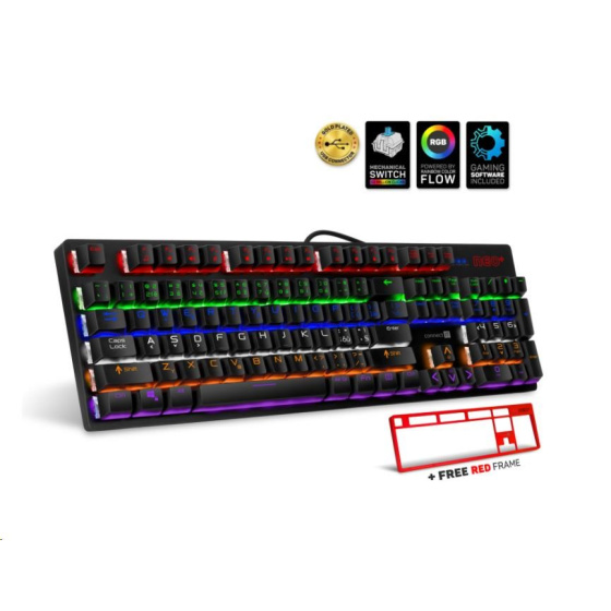 Profesionálna mechanická klávesnica radu NEO+ pre hráčov počítačových hier v českom a slovenskom rozložení s celkom 22 režimami farebného dúhového podsvietenia a päťstupňovou reguláciou intenzity podsvietenia. K dispozícii je 12 multimediálnych tlačidiel.